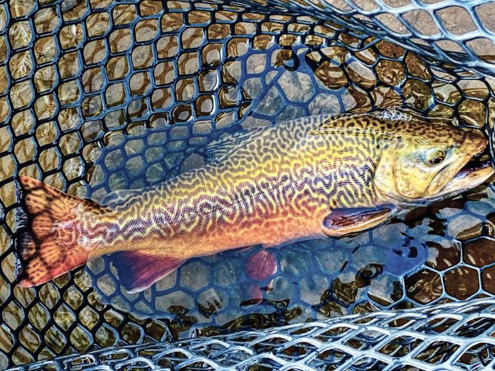 Tiger trout are a hybrid between a female brown trout and a male brook trout. They are greenish yellow to brown with dark patches along their sides creating a maze-like pattern. Their belly is yellowish orange and the tail fin is square. The name derives from the pronounced vermiculations, which evoke the stripes of a tiger. The fish is an anomaly in the wild, with the brook trout having 84 chomosomes and the brown trout 80. The cross itself is unusual in that the parents are members of different.